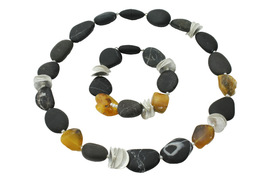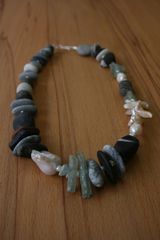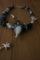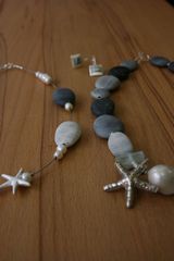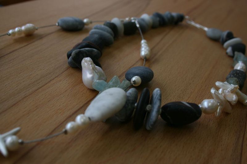Die Kieselsteine werden an verschiedenen Küsten Europas handverlesen und in der Werkstatt von einem langjährigen Mitarbeiter weiter verarbeitet, mit Diamant exakt gebohrt und in der Steintrommel veredelt. Nach dem Bohren wird die Oberfläche noch einmal durch Abschleifen geglättet. Die endgültige Farbintensität entwickelt sich jedoch erst durch den natürlichen Poliereffekt der Haut am Hals der Trägerin.
