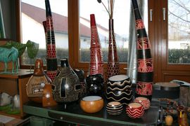 Immer wieder beliebte traditionelle Handarbeiten aus dem Herzen Afrikas sind perlenbestückte, bemalte und geschnitzte, halbe oder ganze Kalebassen/Flaschenkürbisse. Die Kürbisgefäße sind überwiegend zur Aufbewahrung und zum Transport von Flüssigkeiten bestimmt. Sie werden aus der ausgehöhlten und getrockneten Hülle des Flaschenkürbisses, der Kalebasse, hergestellt. Daneben dient der ausgehöhlte Kürbis auch als Resonanzkörper von Musikinstrumenten, etwa die Stegharfe Kora oder die afrikanischen Trommeln. Um die Früchte, genauer Beeren, der Flaschenkürbispflanze als Gefäß benutzen zu können, müssen die Kürbisse ausreifen und danach langsam luftgetrocknet werden. Dadurch bildet sich aus der sonst eher fleischigen Fruchthülle des Kürbisses eine harte, wasserundurchlässige und holzige Außenhaut, die durch Schnitzereien, Farb- oder Brandbemalungen und Kerbungen verziert werden kann.