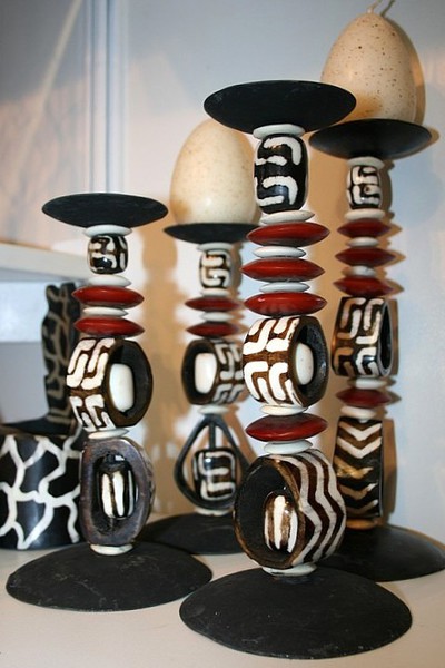 Jeder handgefertigte Kerzenständer ist ein Unikat. Die Kerzenständer in ca. 20cm bis 30 cm Höhe, aus Stahl gehämmert, sind mit Rinderknochenperlen oder Schnitzereien bestückt. Sie wurden gebleicht, gebatikt oder mit Naturfarben (Tee, Mineralien) gefärbt.